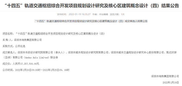日前,經(jīng)深圳市地鐵集團有限公司官網(wǎng)中標公示通過,公司軌道交通院作為聯(lián)合體牽頭方參投的“‘十四五’軌道交通樞紐綜合開發(fā)項目規(guī)劃設計研究及核心區(qū)建筑概念設計(四)”喜獲中標,中標金額人民幣1700余萬元。