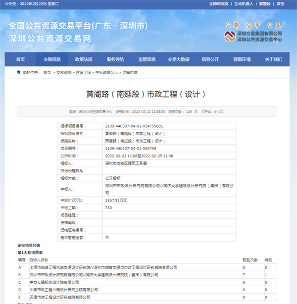 2022年2月22日,經(jīng)深圳市公共資源交易中心中標(biāo)公示通過,深圳市政院與同濟(jì)大學(xué)建筑設(shè)計研究院(集團(tuán))有限公司(聯(lián)合體)在深圳市龍崗區(qū)建筑工務(wù)署黃閣路(南延段)市政工程(設(shè)計)項目公開招標(biāo)中成功中標(biāo),中標(biāo)金額為1867.55萬元。