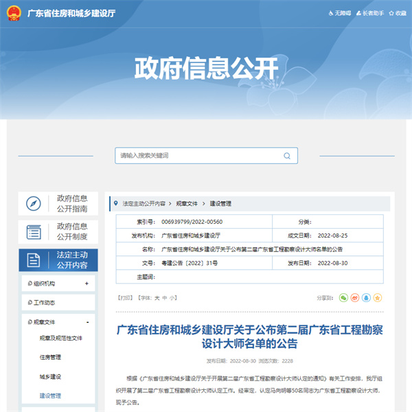 2022年8月30日,廣東省住房和城鄉(xiāng)建設(shè)廳網(wǎng)站發(fā)布第二屆廣東省工程勘察設(shè)計(jì)大師評(píng)選結(jié)果,公司總工程師徐波、首席專(zhuān)家靳守杰、特聘專(zhuān)家王建新榜上有名,獲評(píng)廣東省工程勘察設(shè)計(jì)大師。同時(shí)獲評(píng)3位廣東省工程勘察設(shè)計(jì)大師,體現(xiàn)了公司在尖端科技人才培養(yǎng)、專(zhuān)家團(tuán)隊(duì)建設(shè)的發(fā)展優(yōu)勢(shì),標(biāo)志著公司在人才工程建設(shè)方面取得了階段性勝利,為企業(yè)技術(shù)創(chuàng)新、成果轉(zhuǎn)化、人才培養(yǎng)等方面提供了更廣闊的發(fā)展空間。