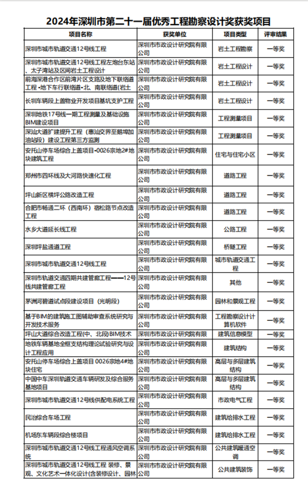 2024年深圳市第二十一屆優(yōu)秀工程勘察設計獎評選結果正式揭曉。經過三輪嚴格的評審流程,公司共82個項目獲獎,包括一等獎25項、二等獎32項、三等獎25項。獎項覆蓋了工程勘察與巖土工程、住宅及住宅小區(qū)設計、市政公用工程設計等13個主要關鍵領域。