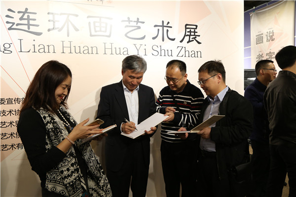 董事長(zhǎng)陳宜言大師在連環(huán)畫(huà)展廳被參觀者圍繞簽名
