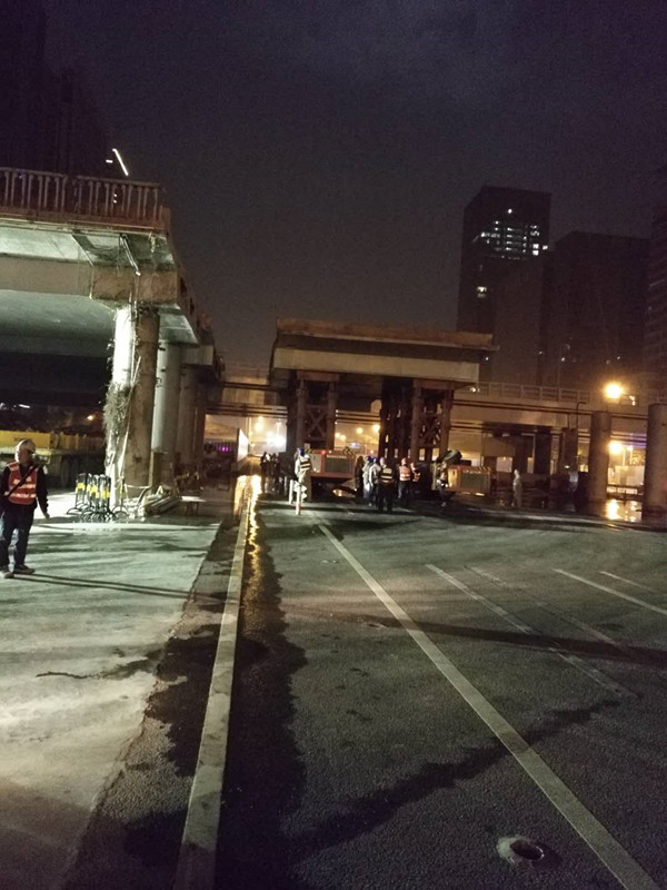 施工單位提前完成橋面設(shè)施拆除、鉆孔、設(shè)備安裝等準(zhǔn)備工作后,2017年12月29日晚11點開始拆橋工作,至2018年1月2日凌晨4點深南大道南北兩側(cè)交替封道4晚,彩田橋中間4跨連續(xù)梁采用SPMT模塊車順利拆除。拆除橋梁長度約200m,共切割成22段梁體,單個梁體最大重量達(dá)300t,是目前國內(nèi)首座采用SPMT模塊車快速拆除的預(yù)應(yīng)力混凝土連續(xù)梁橋。全橋拆除時間與建設(shè)福田樞紐時60天拆除益田橋相比,時間僅為其1/6,我公司的技術(shù)創(chuàng)新充分證明了“深圳速度”,而且為橋梁工程的發(fā)展增添了寶貴經(jīng)驗。