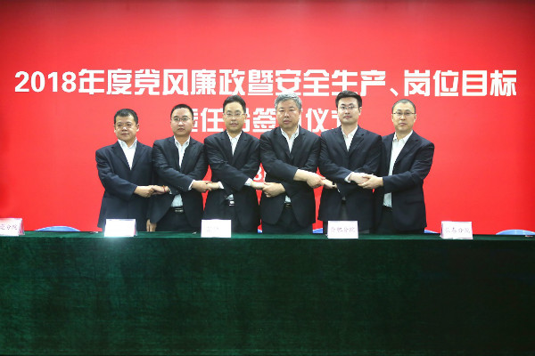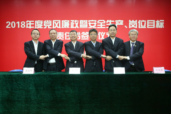 儀式開始,黨委書記、董事長陳宜言與黨委副書記、總經(jīng)理蔡明和黨委副書記、紀委書記、工會主席郭明簽署了《2018年度崗位目標責任書》、《2018年度黨風廉政責任書》及《2018年度安全生產(chǎn)責任書》。黨委副書記、總經(jīng)理蔡明與副總經(jīng)理歐陽宇峰、副總經(jīng)理王建新、副總經(jīng)理張健君、副總經(jīng)理許華林、總工程師徐波簽署責任書。緊接著,各分管領導與分管部門負責人簽署責任書。